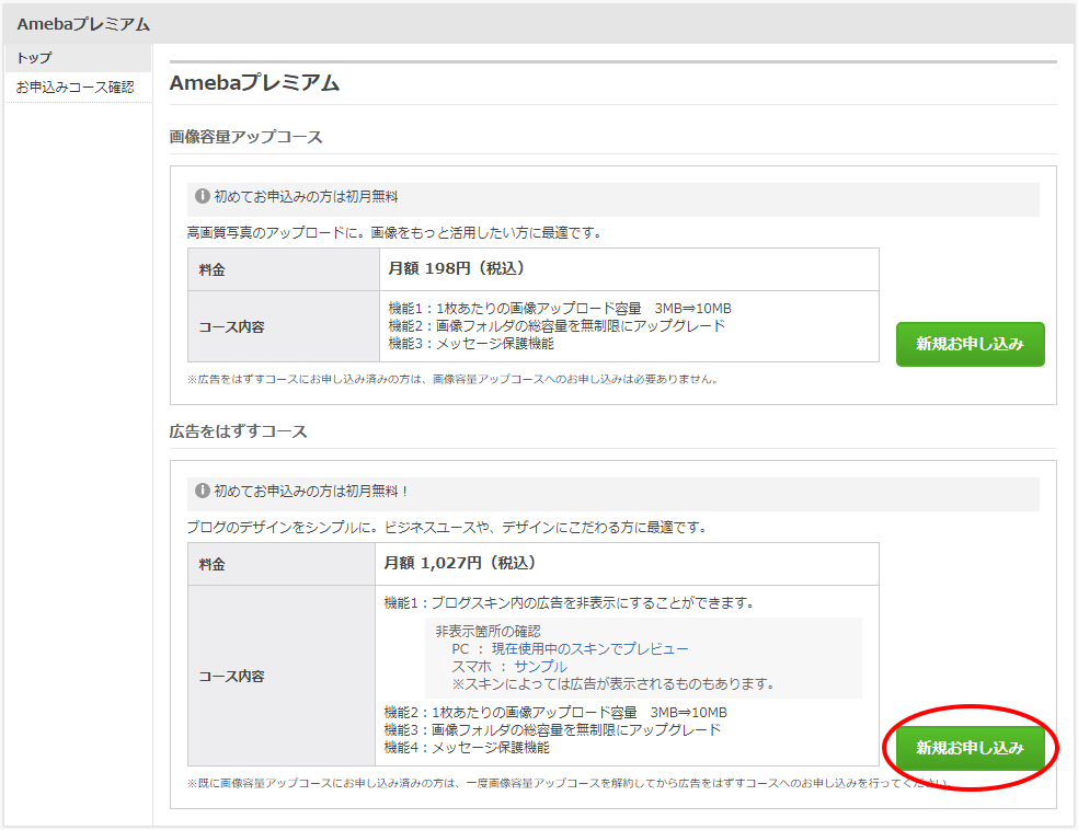 「Amebaプレミアム」の画面が表示されたら、「広告をはずすコース」の枠内にある「新規お申し込み」というボタンをクリックします。