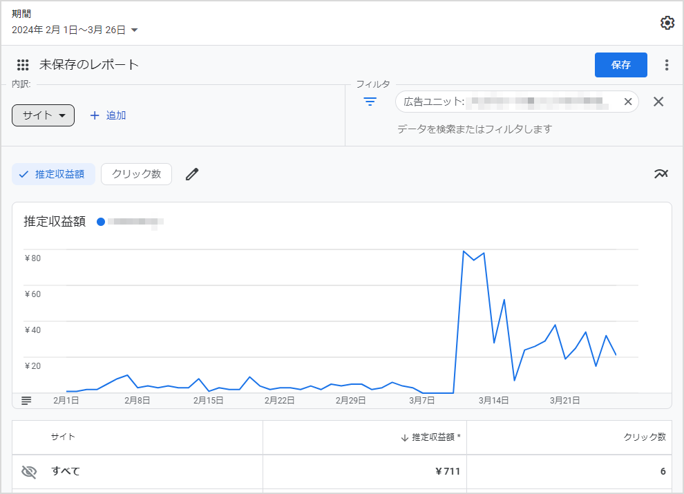 ちなみに、訪問者数が少ないということもあって、クリックされることはほとんど無いので、ほぼ全てインプレション収益です。