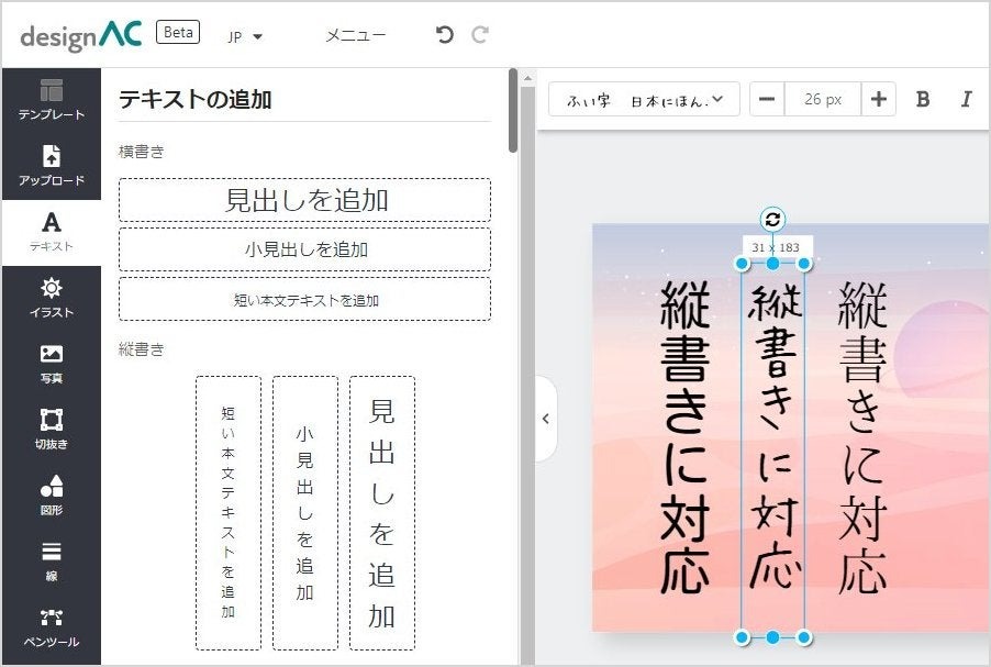 また、テキストの縦書きにしっかり対応してくれていたり、日本語フォントがかなり豊富に用意されているあたりもポイントが高いと思います。