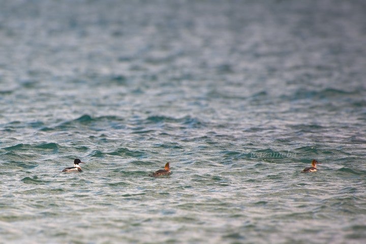 少し沖の方を見てみると、冬鳥のウミアイサが数羽、浮かんだり潜ったりしています。
