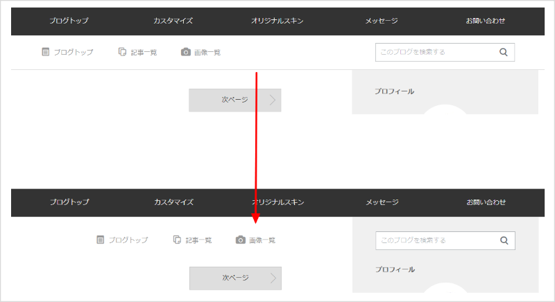 「ブログトップ」「記事一覧」「動画一覧」の3つのリンクは、旧CSS編集用デザインのようにメインカラムの一番上にある感じにし、検索ボックスは、サイドバーの一番上にあるように見えるようカスタマイズしてみました。