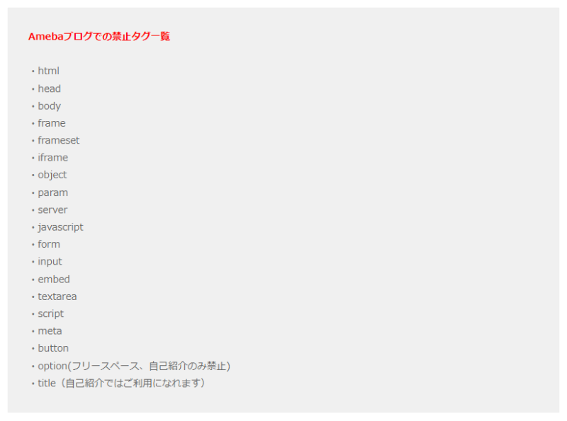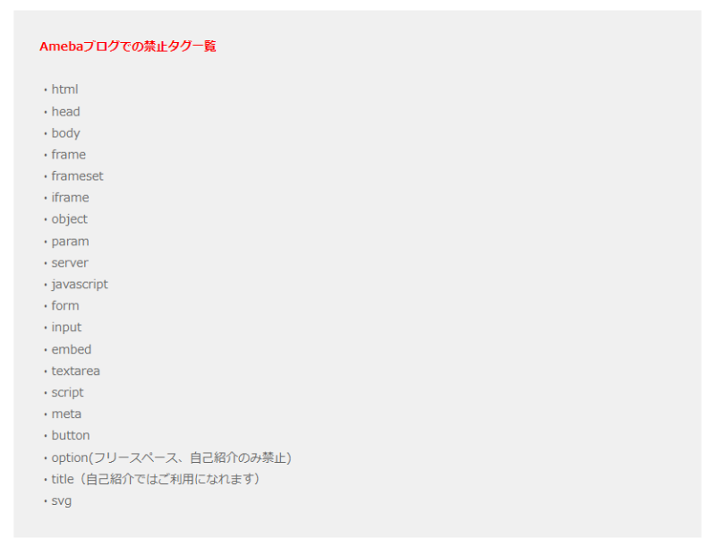 ちなみに、ヘルプの禁止タグに関するページを見ると、確かに禁止タグの一覧の一番下に書いてあります。
