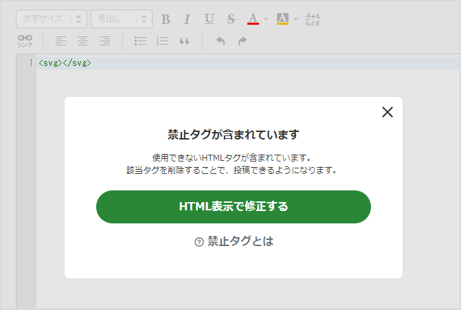 SVGは、データサイズがコンパクトで拡大縮小しても形が崩れにくい便利な画像形式で、アイコンなどでも普通に頻繁に利用されるものなので、禁止タグにする意味がわかりませんが…。